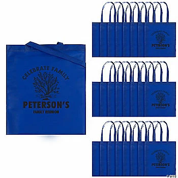 • Multi-purpose: These convenient tote bags can carry a wide range of everyday essentials, including books, toys, snacks, sunglasses, and more! Bring one along with you on special outings to the park, the farmer’s market, or even the grocery store. You’ll be glad you did! • Durable Quality: These sturdy tote bags won’t let you or your day-to-day accessories down. Plus, you can easily store the reusable bags away until you need them again.• Travel-Friendly: No matter where your day takes you, these tote bags are sure to be handy companions! Designed with easy-to-use straps and a spacious interior compartment, these tote bags can keep up with your on-the-go schedule! Product Description:Perfect for family reunions, these Personalized Family Tree Tote Bags are preprinted with “Celebrate Family” and a prosperous tree. Pick your color and make sure your family name is included in the customized text, then hand these bags out at the reunion filled with an album of old family pictures, can covers and other favors that will make your reunion even more memorable. Personalize with 3 lines of text. © OTCSize: 15″ x 17″ with 12″ handles.Quantity: 24Material: Nonwoven polypropylene.