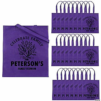 • Multi-purpose: These convenient tote bags can carry a wide range of everyday essentials, including books, toys, snacks, sunglasses, and more! Bring one along with you on special outings to the park, the farmer’s market, or even the grocery store. You’ll be glad you did! • Durable Quality: These sturdy tote bags won’t let you or your day-to-day accessories down. Plus, you can easily store the reusable bags away until you need them again.• Travel-Friendly: No matter where your day takes you, these tote bags are sure to be handy companions! Designed with easy-to-use straps and a spacious interior compartment, these tote bags can keep up with your on-the-go schedule! Product Description:Perfect for family reunions, these Personalized Family Tree Tote Bags are preprinted with “Celebrate Family” and a prosperous tree. Pick your color and make sure your family name is included in the customized text, then hand these bags out at the reunion filled with an album of old family pictures, can covers and other favors that will make your reunion even more memorable. Personalize with 3 lines of text. © OTCSize: 15″ x 17″ with 12″ handles.Quantity: 24Material: Nonwoven polypropylene.