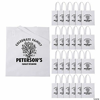 • Multi-purpose: These convenient tote bags can carry a wide range of everyday essentials, including books, toys, snacks, sunglasses, and more! Bring one along with you on special outings to the park, the farmer’s market, or even the grocery store. You’ll be glad you did! • Durable Quality: These sturdy tote bags won’t let you or your day-to-day accessories down. Plus, you can easily store the reusable bags away until you need them again.• Travel-Friendly: No matter where your day takes you, these tote bags are sure to be handy companions! Designed with easy-to-use straps and a spacious interior compartment, these tote bags can keep up with your on-the-go schedule! Product Description:Perfect for family reunions, these Personalized Family Tree Tote Bags are preprinted with “Celebrate Family” and a prosperous tree. Pick your color and make sure your family name is included in the customized text, then hand these bags out at the reunion filled with an album of old family pictures, can covers and other favors that will make your reunion even more memorable. Personalize with 3 lines of text. © OTCSize: 15″ x 17″ with 12″ handles.Quantity: 24Material: Nonwoven polypropylene.