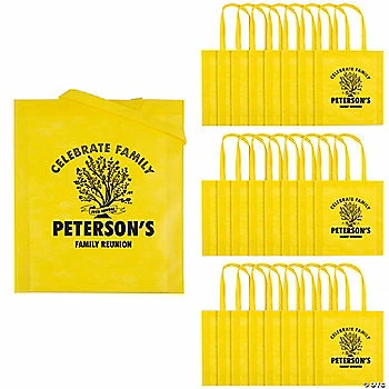 • Multi-purpose: These convenient tote bags can carry a wide range of everyday essentials, including books, toys, snacks, sunglasses, and more! Bring one along with you on special outings to the park, the farmer’s market, or even the grocery store. You’ll be glad you did! • Durable Quality: These sturdy tote bags won’t let you or your day-to-day accessories down. Plus, you can easily store the reusable bags away until you need them again.• Travel-Friendly: No matter where your day takes you, these tote bags are sure to be handy companions! Designed with easy-to-use straps and a spacious interior compartment, these tote bags can keep up with your on-the-go schedule! Product Description:Perfect for family reunions, these Personalized Family Tree Tote Bags are preprinted with “Celebrate Family” and a prosperous tree. Pick your color and make sure your family name is included in the customized text, then hand these bags out at the reunion filled with an album of old family pictures, can covers and other favors that will make your reunion even more memorable. Personalize with 3 lines of text. © OTCSize: 15″ x 17″ with 12″ handles.Quantity: 24Material: Nonwoven polypropylene.