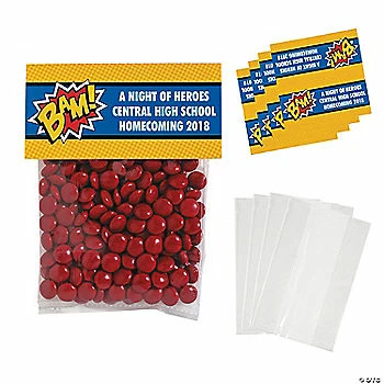โข Personalize It!: Personalized packaging adds unforgettable style to your event and makes your guests feel festive and appreciated.โข Say Thanks with Sweets: Are you looking for an easy way to thank the people in your life? These multipurpose bags filled with great snacks are a sweet way to spread appreciation among party guests, students and teachers, or employees!โข Easy to Assemble: Fill these goodie bags with your own awesome giveaways and toothsome treats, then simply staple them shut. No muss, no fuss, and loads of fun for your celebration!Product Description:Save the day with DIY party favor bags! Each cellophane bag features a vintage comic-style display card that reads “BAM!” and your own personalized message. These party favor bags are great for a superhero-themed prom, homecoming, corporate event, or birthday party. Just fill the bags with your own party favors, fold the personalized card in half, and staple the card to the top of the bag to seal it. Personalize with 3 lines of 20 characters/spaces per line. Simple assembly required. Size: Bags, 4″ x 5 1/2″; folded cards, 4 3/4″ x 2 1/4″ Quantity: 50Material: Cellophane and cardstockยฉ OTCยฉ OTC