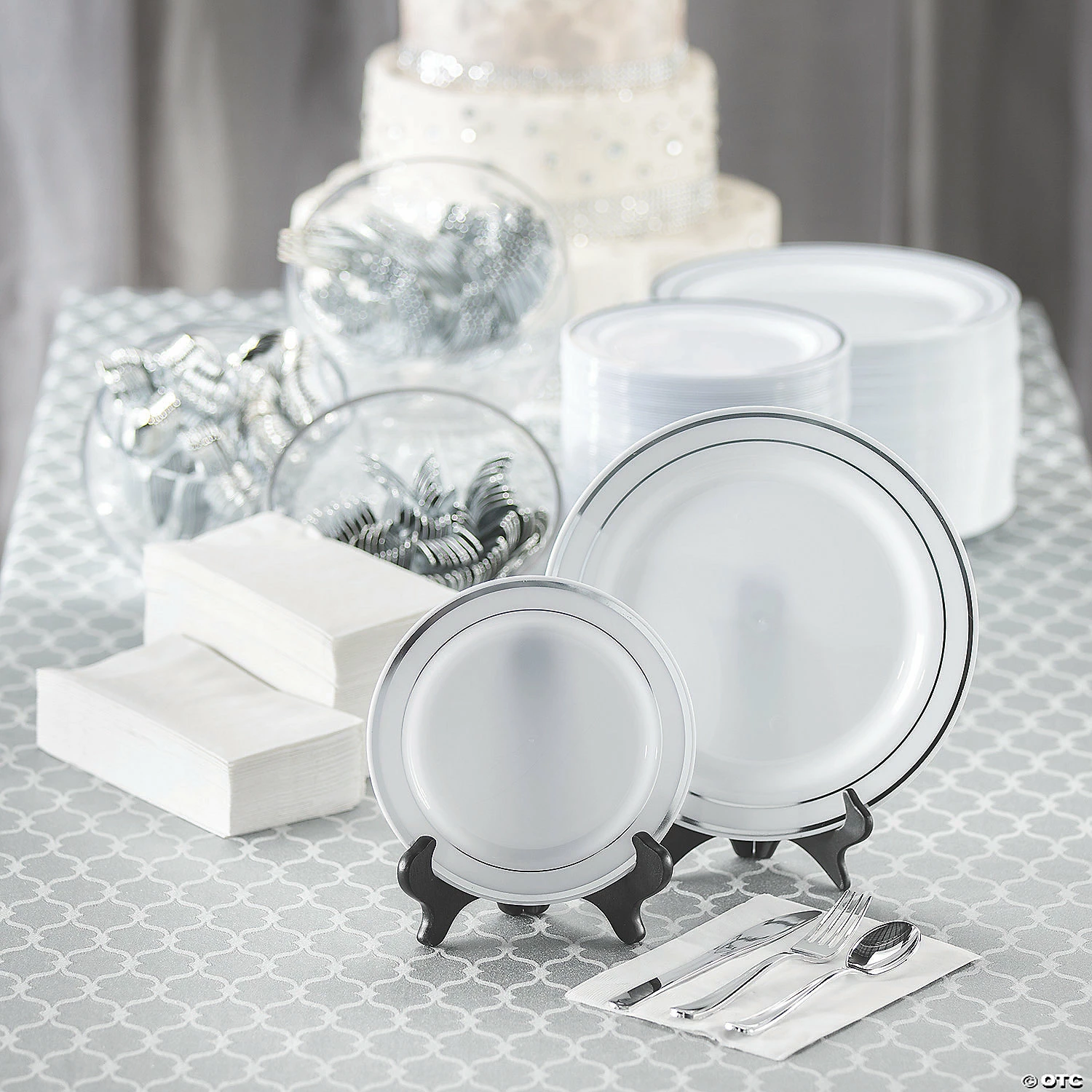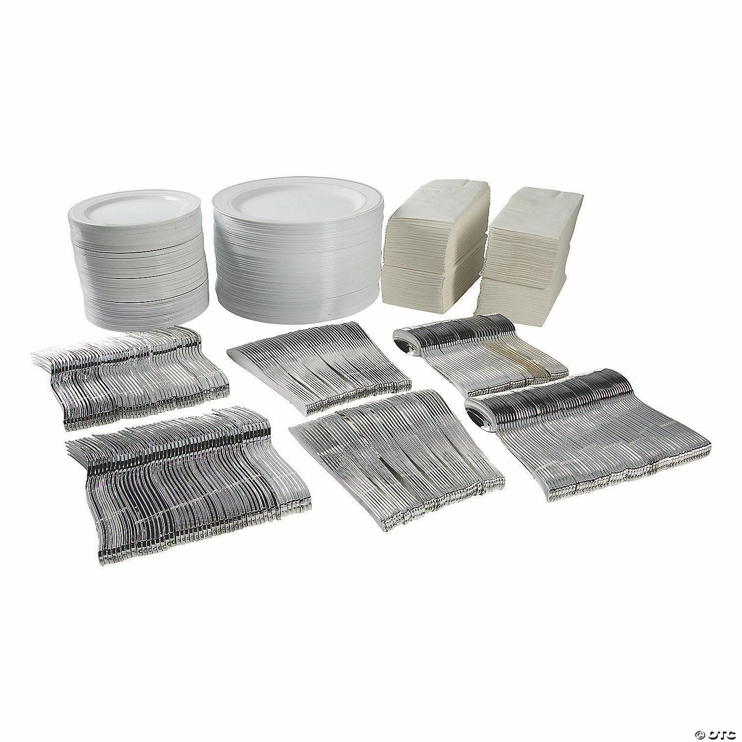 Set your tables in style with this huge premium tableware set! With plastic plates, plastic cutlery and paper napkins for 96 guests, this party kit is ideal for a wedding reception, awareness luncheon or another special occasion when you’re serving a meal for a large group. Layer your table settings with these high-end plastic plates that have the look of china โ but the cost and convenience of disposable plates. (588 pcs. per unit)Includes:โขย 100 Premium Plastic Dessert Plates (7″)โขย 100 Premium Plastic Dinner Plates (9″)โขย 96 Premium Plastic Spoons (7″)โขย 96 Premium Plastic Knives (7 3/4″)โขย 96 Premium Plastic Forks (7 1/2″)โขย 100 Paper Dinner Napkins (4 1/4″ x 8″)