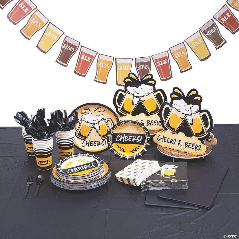If you believe that there’s no better way to celebrate than by raising a glass, then this party kit is perfect for you! With enough disposable tableware and party supplies for two dozen guests, this party assortment will work for a birthday party, retirement party or any other special occasion. Pick it up, stock up on your favorite brew and get ready to party with 24 of your closest friends! (190 pcs. per unit) Includes:• 3 Plastic Black Tablecloths (54″ x 108″)• 1 Cardstock Beer Garland (7 ft.)• 2 Foam Beer Centerpieces (9″ x 11″)• 24 Plastic Black Forks (6 1/2″)• 24 Plastic Black Spoons (6 1/2″)• 32 Cheers & Beers Beverage Napkins (5″)• 32 Cheers & Beers Luncheon Napkins (6 1/2″)• 24 Cheers & Beers Dinner Plates (9″)• 24 Cheers & Beers Dessert Plates (7″)• 24 Cheers & Beers Cups (3 3/4″ 9 oz.)