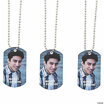 Celebrate birthdays, graduations, weddings and so much more with these custom dog tag necklaces! Add the smiling face of the honored person plus your own message of thanks, congratulations or whatever else you wish to say. With 24 necklaces per package, this jewelry could also make a fun end-of-year gift from teachers to their students! Personalize with 2 lines of text and upload 1 photo. Metal. Each 2″ dog tag is on a 24″ chain. © OTC