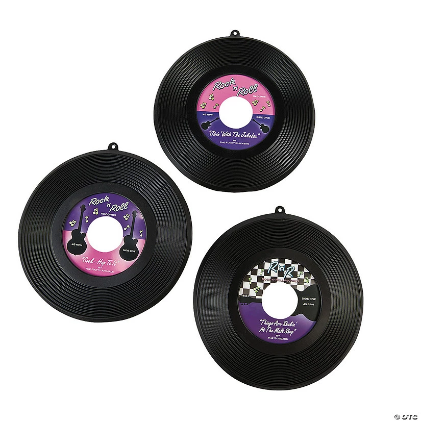 These records make cool decorations for a retro rock ‘n’ roll party! Decorate your 50s party theme in sock hop style with these decorations that look like 45 rpm records. Perfect for any musical-themed event, dance or luncheon. Plastic. (6 pcs. per set) 9″ diam. ยฉ OTC