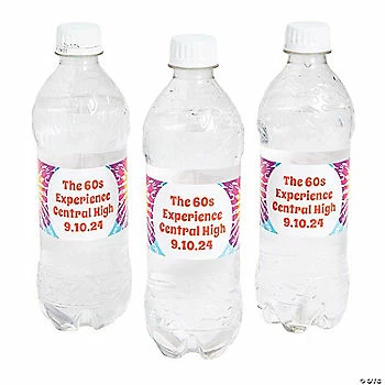 Transform a normal plastic water bottle into a groovy drink for a 60’s theme party with the help of these tie-dyed water bottle labels. The colorful tie-dyed design alongside the personalized text make these water bottle labels turn water bottles into impressive 60’s party favors or personalized beverage bar supplies. Vinyl. (50 pcs. per unit) 9″ x 2″ Personalize with 4 lines of text. Labels fit best on 20 oz. water bottles, not included. © OTC
