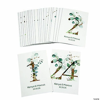 Help wedding reception guests find their tables quickly with these lovely table numbers. Featuring a pretty Eucalyptus design along with personalized text, these table numbers cover tables one through twenty-four. These eye-catching table numbers will be a big help to reception guests trying to find their table. Cardstock. (2 dozen per unit) 4″ x 6″ Personalize with 2 lines of text. © OTC