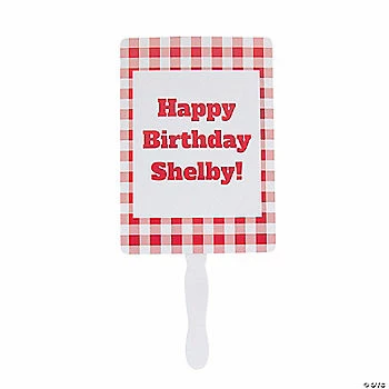 Have these hand fans handy for guests to use to keep cool and comfortable at an outdoor gathering or indoor celebration in a stuffy venue. Featuring personalized text and a cute red gingham border, these hand fans are must-have supplies for birthday BBQs, outdoor family reunions and informal wedding receptions. Guests can take a fan home as a personalized party favor. Cardstock. 6″ x 8 1/2″ with 8″ plastic handle. Personalize with 3 lines of text. Simple assembly required. ยฉ OTC