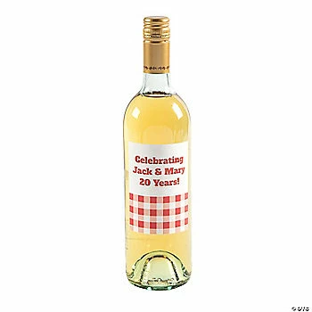 Cheers! Transform a regular wine bottle into a personalized one with these cute labels featuring a red gingham plaid pattern and personalized text. These vinyl stickers are designed to fit well on any standard size wine bottle. A great addition to guest tables at a wedding reception, anniversary dinner or any other event where wine is served, these labels can also turn wine bottles into personalized party favors that will impress guests. Vinyl. 3 1/4″ x 4″ Personalize with 3 lines of text. © OTC
