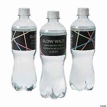 Glow wild at an amazing glow party! Make sure you serve up plenty of drinks to make sure eveyone stays hydrated as they move and glow through the night, and use these water bottle labels to customize the drinks. Just include the name of your party or group or event and stick these labels on bottles of water, soda or other drinks. Find glow jewelry and glow sticks to hand out at your party elsewhere on this website. Personalize with four lines of text. Vinyl. (50 pcs. per unit) 9″ x 2″ ยฉย OTC