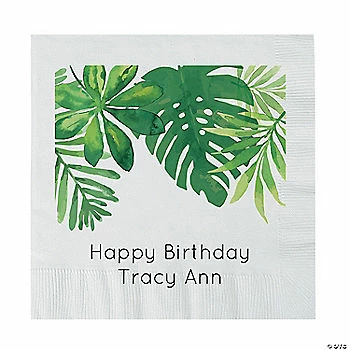 Whatβs the most unique touch for a tropical birthday party, luau bash or Hawaiian party? Custom tableware, of course! These napkins are adorned with lush palm leaves, with plenty of space for a message of your choice. Top off your look with other luau tableware, decorations and party favors here on this site! Personalize with 2 lines of text. Paper. (50 pcs. per unit) 6 1/2″ Β© OTC