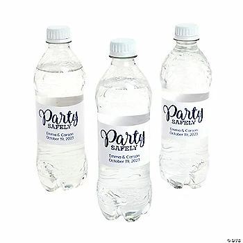 Help wedding reception or party guests stay hydrated as they dance the night away with these personalized water bottle labels. Designed to perfectly fit a 20 oz. plastic water bottle, these labels add a personalized flair to the beverage station or bar. Each label has the message “Party safely” along with personalized text. Vinyl. (50 pcs. per unit) 9″ x 2″ Water bottles not included. Personalize with 2 lines of text. © OTC
