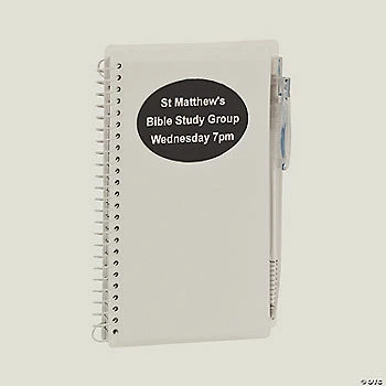 Whether you’re planning something for the school spirit store, giveaways for your company or looking for a new branding opportunity – these notebooks with pens are the perfect answer! Choose your color and personalize the sticker with 3 lines of text. Includes a 6″ plastic cover with 60-pg. lined notepad and matching 5 1/2″ pen. Simple assembly required to apply personalized sticker. © OTC