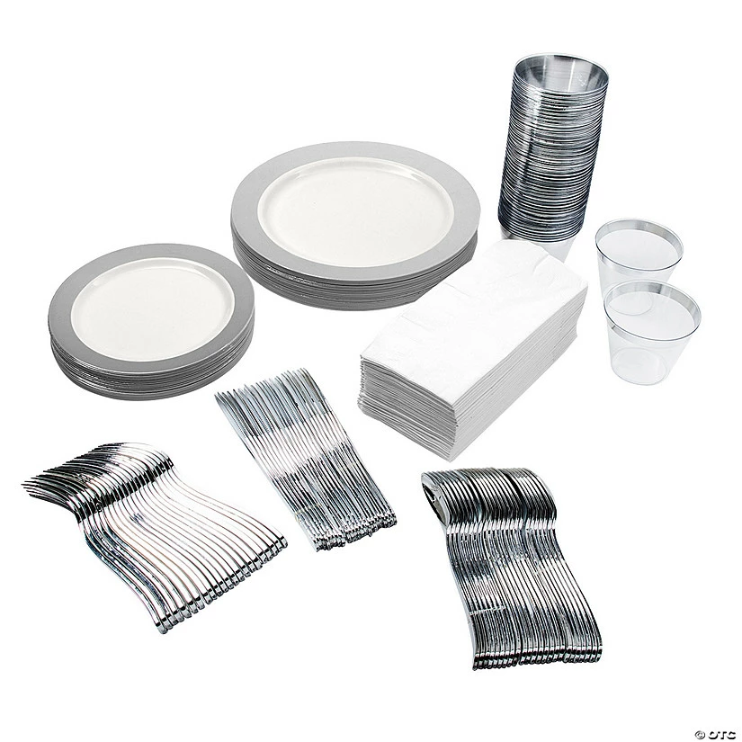 Increase the elegance of your formal meal with the help of this premium tableware kit. Featuring enough plastic cutlery sets, cups, plates and more for up to two dozen guests, this kit is an easy and budget-friendly way to give a wedding reception, anniversary dinner or fundraiser meal a chic look and feel. (222 pcs. per unit) Assortment may vary. Not microwave safe.Includes:• 24 Plastic Premium Metallic Silver Cutlery Sets (72 pcs. per unit. Includes 7″ spoons, 7 3/4″ knives and 7 1/2″ forks.)• 25 Plastic Premium Ivory Dessert Plates with Silver Trim (7 1/2″)• 25 Plastic Premium Ivory Dinner Plates with Silver Trim (10 1/2″)• 50 Plastic Small Cups with Silver Trim (2 3/4″ 9 oz.)• 50 Paper White Dinner Napkins (4 1/4″ x 8″)