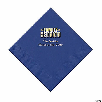 Hold your family feast in style! Whether you all get together every year, every 10 years or infrequently, use these custom napkins to commemorate the big family reunion. Add a personal touch to these party supplies; they already say “Family Reunion”, so all you have to do is add your family name and the date. Set out these personalized napkins near your drink station, food bar or at individual place settings. Printed with gold foil. Personalize with two lines of text. Paper. (50 pcs. per unit) 6 1/2″ Not microwave safe. Β© OTC